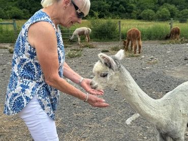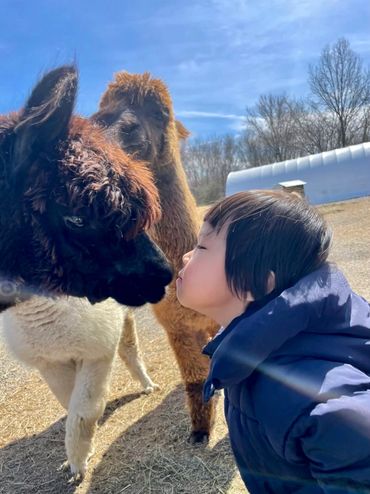 Friendly alpaca visits on a sunny family farm. Smiling children watch.